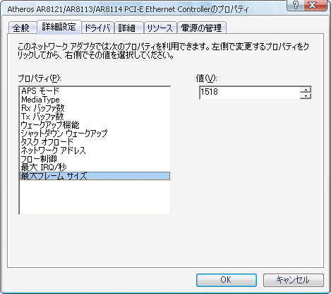 取り敢えず9k MTUに設定して、次にサブPCも9000に設定しようとしたら、サブPCのLANチップは古いせいか最大7168Byte(デフォルトは1518Byte) までしか対応してない(Jumbo Frameとは表記していない)事が判りました。