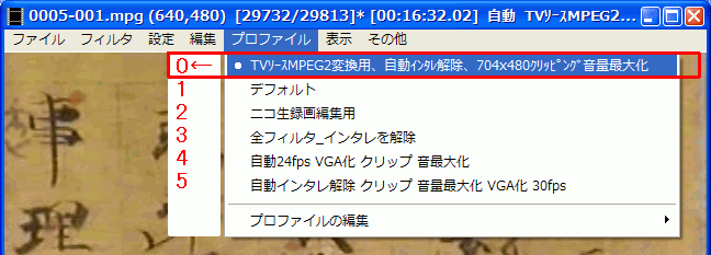 Const OUTPUT_PROFILE = 0 ※あらかじめ、インターレース解除や、フィルタの設定をしてからプロファイルとして、保存しておいた番号を設定します。順番は以下のようになります。