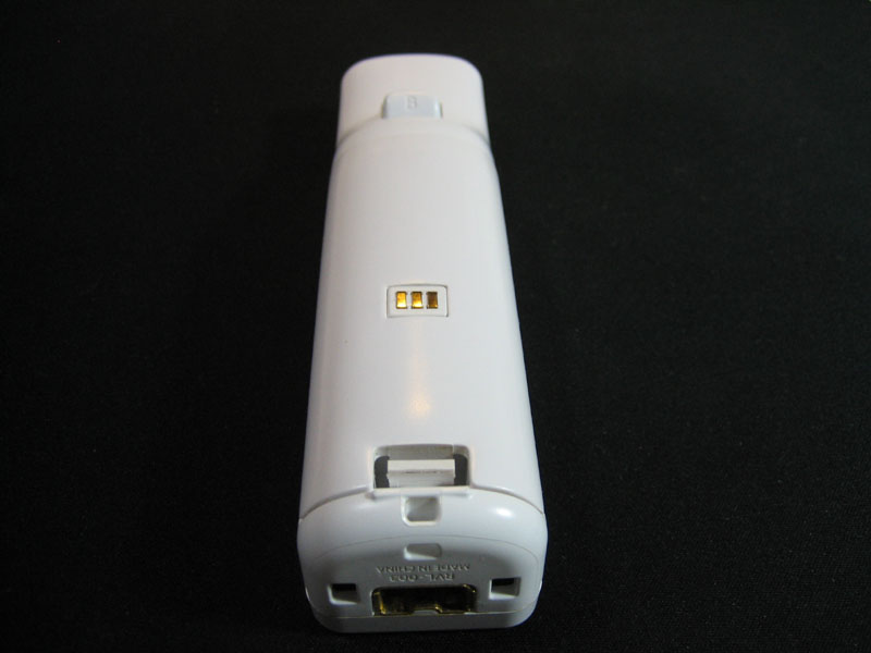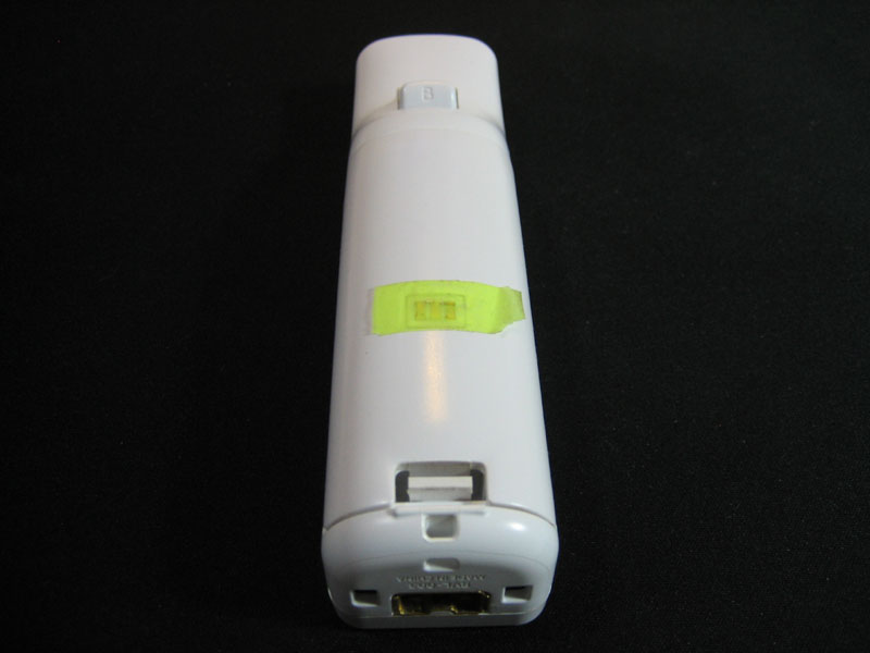 欠点の1つ目は、Wiiリモコン裏の充電用端子部分です。(左の写真)この金属端子が丁度手に当たる位置にあるので、汗で金メッキ下の銅が錆びて、手と金属の接触部分が緑色になってしまう事がありました。なので、右の写真のように充電後はテープを貼って汗がつかないようにしていたのですが、このテープの付け外しが面倒で、手に当たるテープの感触も気になって仕方がありませんでした。