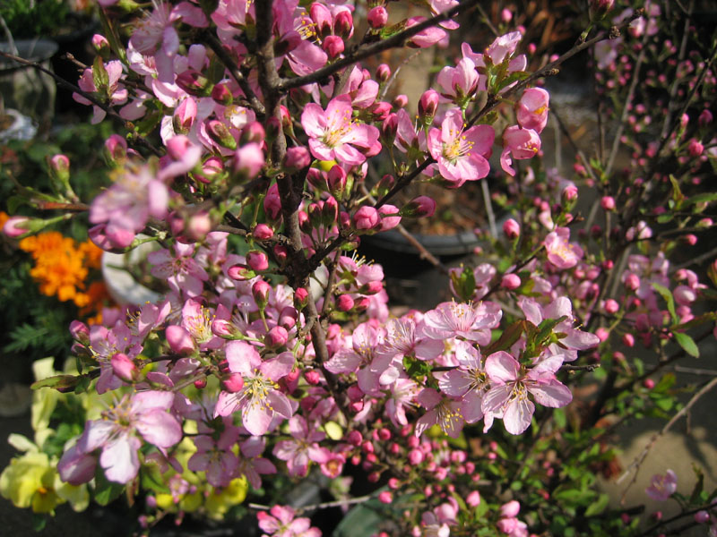 去年買ってきた赤花のニワウメ(庭梅)が今年も無事開花しました。