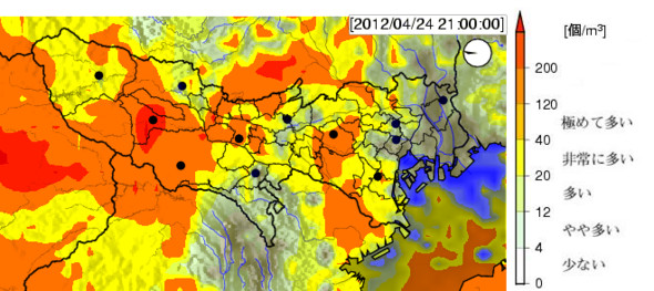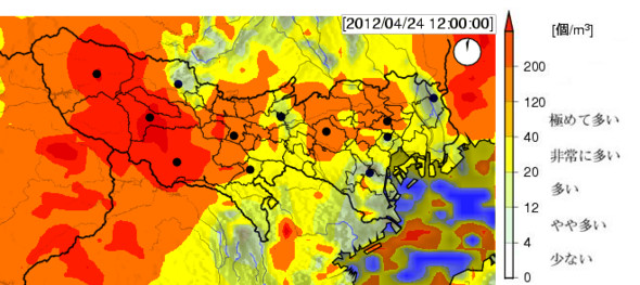上記サイトでは、山では発生した花粉が、時間とともに関東周辺に飛散していく様子をアニメーションで見ることができます。