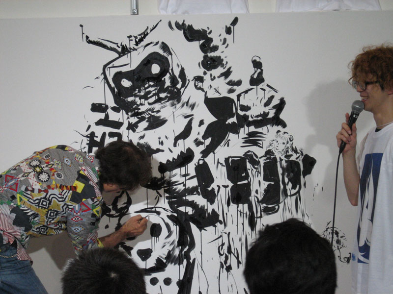このイベントに行く目的の一つだった、FFのイメージイラストなどで有名な、天野喜孝さんのライブペインティングを視聴しました。ニコニコ超会議のイメージマスコット、『ニコニコ超会金』を、ラスボス風に描く。というお題で絵を描いています。