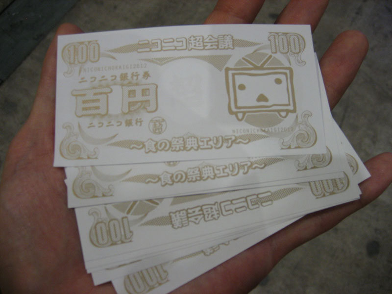 昼食は、最初、ニコニコフードコートで、限定販売のオウムライス(制作動画)辺りを食べようと考えていたのですが、形が奇抜なだけだよな・・・と考えなおし、食の祭典フードコートで何かを食べることにしました。フードコートは金銭のやり取りを円滑化させる為なのか、専用金券式だったので、現金を一度下の金券(左の写真又は上の写真)に変えることに。