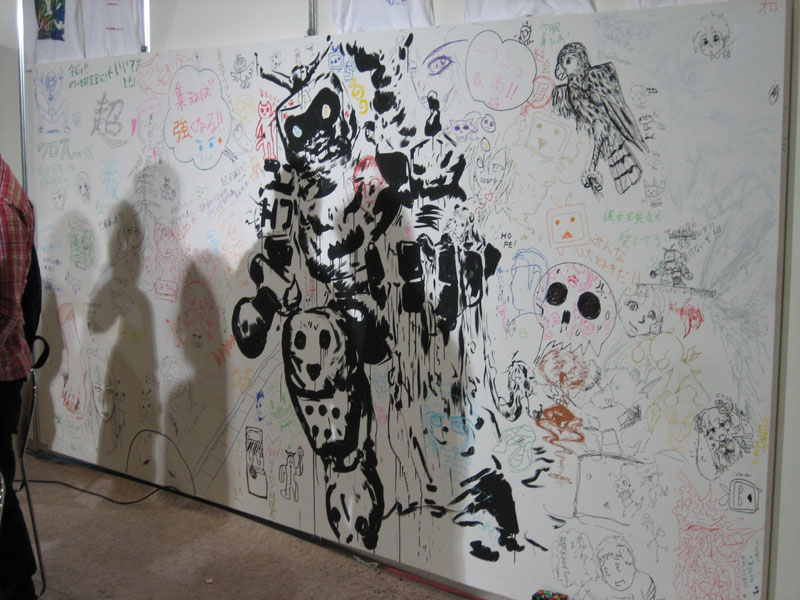 その後、天野さんから、来場者にペンを持って貰い、キャンバスをどんな絵や文字でもいいので埋めてもらいたいという提案があり、28日終了時には下の写真のように文字やら絵で埋まりました。私も少し参加したのですが、こんな機会は無いので、良い思い出になりました。