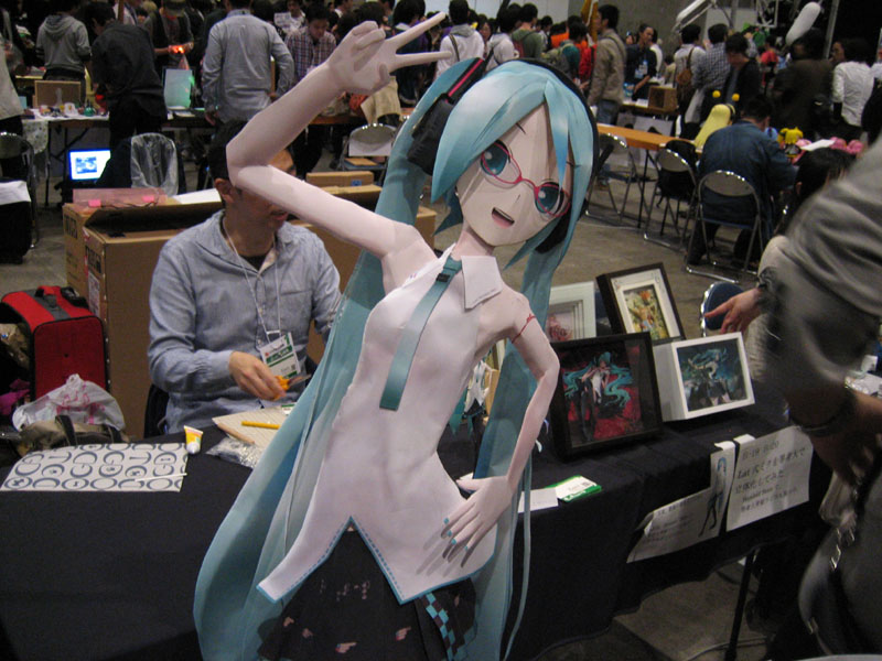 写真は、巨大ペーパークラフトの初音ミク(制作動画)です。シャドーボックスという手法で作ってあるので、立体的に見えます。後ろにちらっと見えている、アームスーツ(スケルトニクス)(制作動画)や、ニキシー管によるスペクトラムアナライザの展示(動作中動画)と動作など、見応えがある展示が並んでいました。