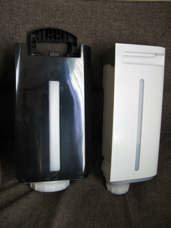左:Z40(白)よりも50ml多く水がはいるので、Z45(黒)は少しサイズが大きいです。横のスリットから残りの水量が確認できます。スリットで水量を確認することは余り無い&タンクの色が乳白色なのですが光の透過度が低いので、水の残量が確認しづらく、Z45のほうがスリットが広いことはあまりメリットではありませんでした。また、Z45のほうには取っ手がついてますが、これもあまりメリットだとは思いません。ペットボトルを持つように持てばいいだけですからね。