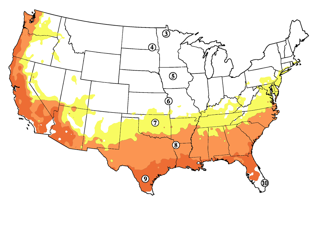 栽培可能地域は、アメリカ南部や、太平洋湾岸の暖かい地域で、冬の寒さが厳しいニューヨークもギリギリOKの様です。緯度で言うと、およそ北緯37°(N37°)より南が栽培可能範囲になり、日本だと南から栃木県の北の県境辺りまでが栽培可能地域になります。(下図参照)