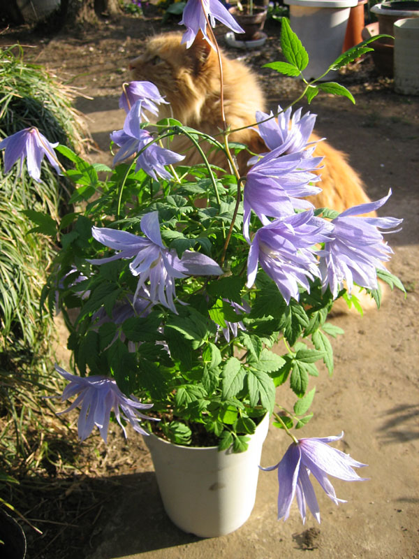 クレマチス、マクロペタラ+ネコです。下を向いた花弁がヒラヒラと揺れるさまはとても綺麗で優雅です。葉っぱは傷の付きやすい華奢な葉っぱで、全体的に繊細で気品のある姿をしています。