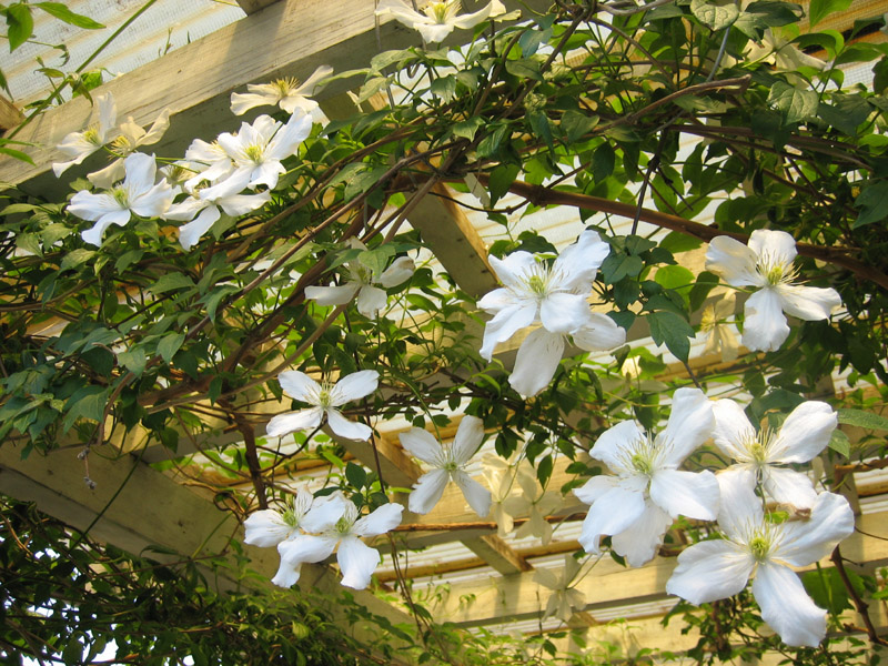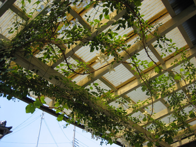 2012/05/05 → 小屋の柱に絡ませたクレマチス、スプーネリーに花
