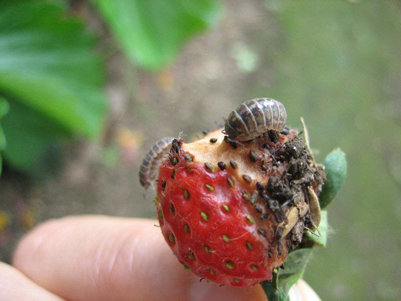 家の庭の一角でダンゴムシが大量発生しているのですが、その側に捨てた摘果したイチゴを、ダンゴムシが食べているのを発見しました。