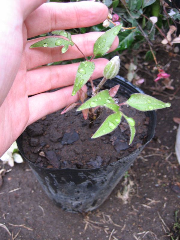 同じくテッセンの改良品種?ピンクレッドです。名前の通りの花色で赤い花の中にピンクのグラデーションが入ります。花の形は丸みを帯びた風車型。花期は4~7月。苗が小さいので、支柱を立てて保護しました。