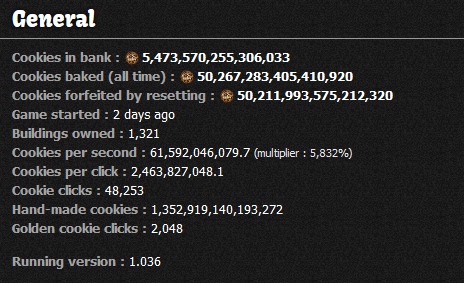他にも、隠し実績がありますが、取得条件が『ゴールデンクッキーを7777回クリック』など厳しいものだった為、クッキーを累計36京枚焼いた所でピリオドを打った形です。