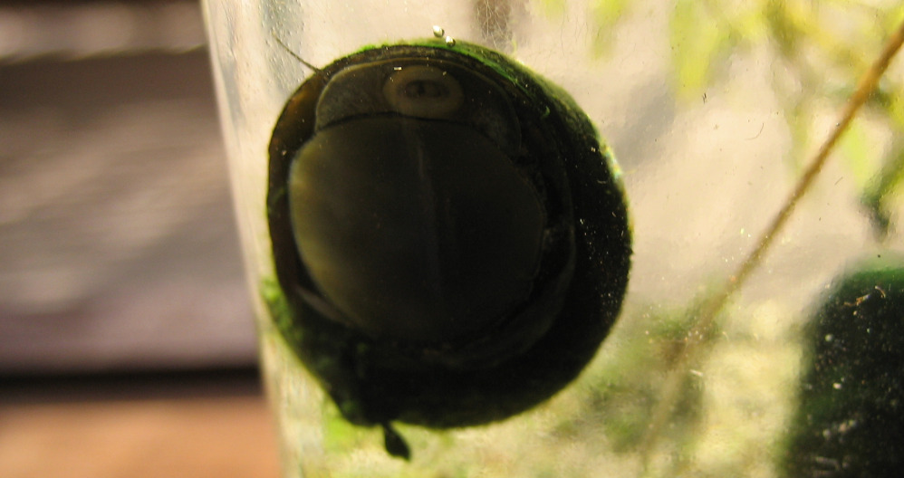 丸い部分が口で、歯を使ってガラス面についた僅かな藻を削りとって食べています。