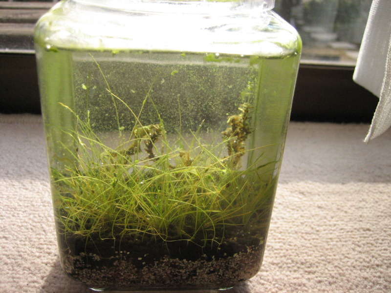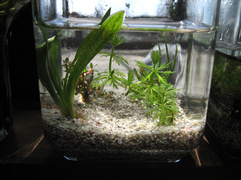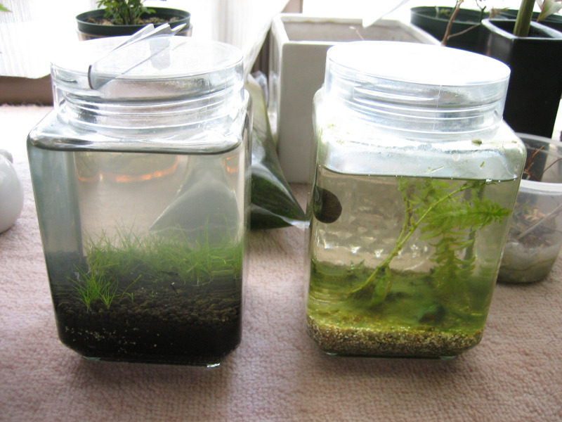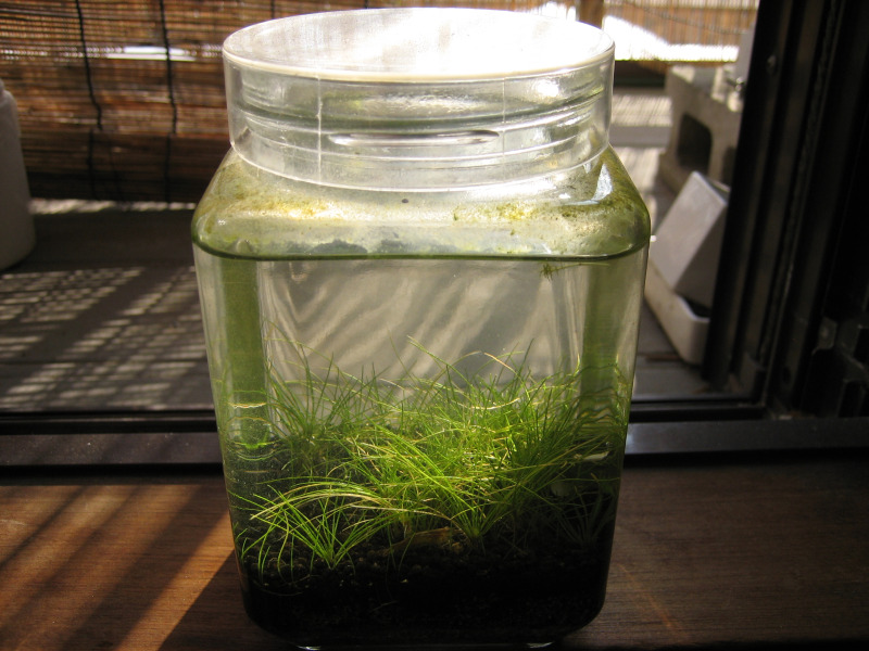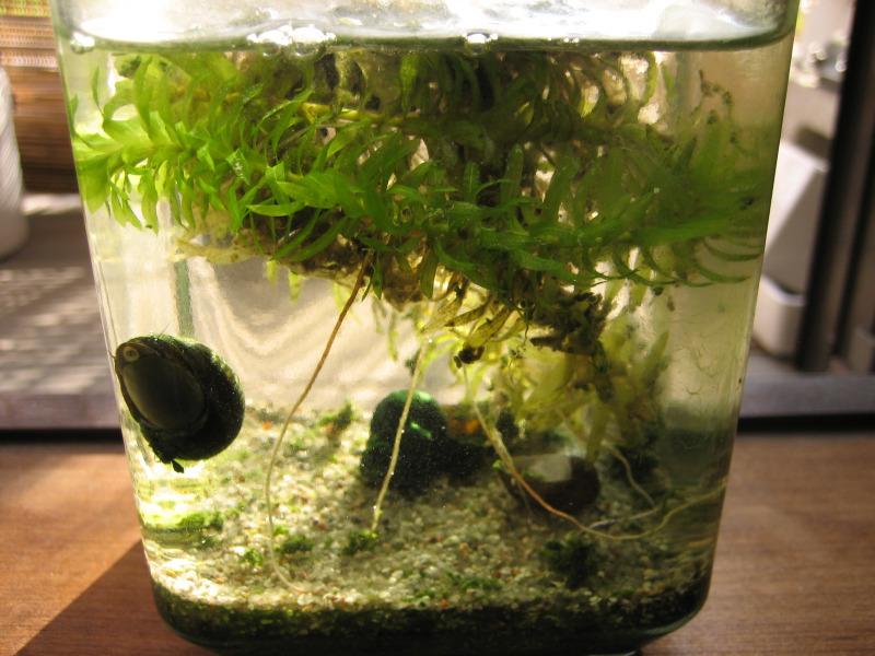 やがて徐々に藻が繁殖してしまい、ボトル壁面と水草が緑色に染まってしまったので、魚などの生体を入れて食べてもらう事にしました。