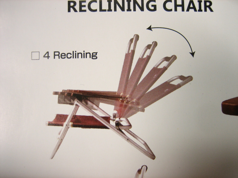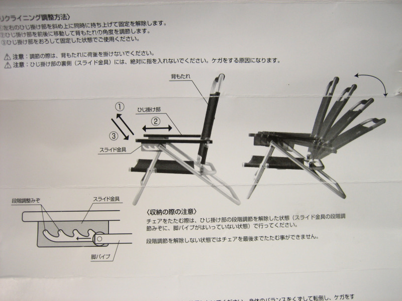 リクライニング構造についての説明書です。リクライニング構造は、脚パイプをはめるスライド金具のミゾの位置を変える事によって実現している事が分かります。
