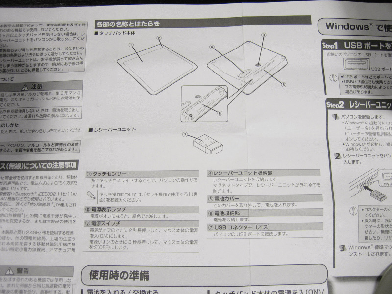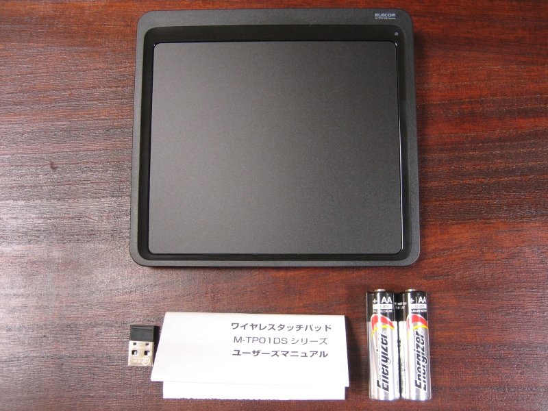 内容品は、タッチパッド本体と、無線式USBレシーバー、動作確認用アルカリ電池2本、説明書です。