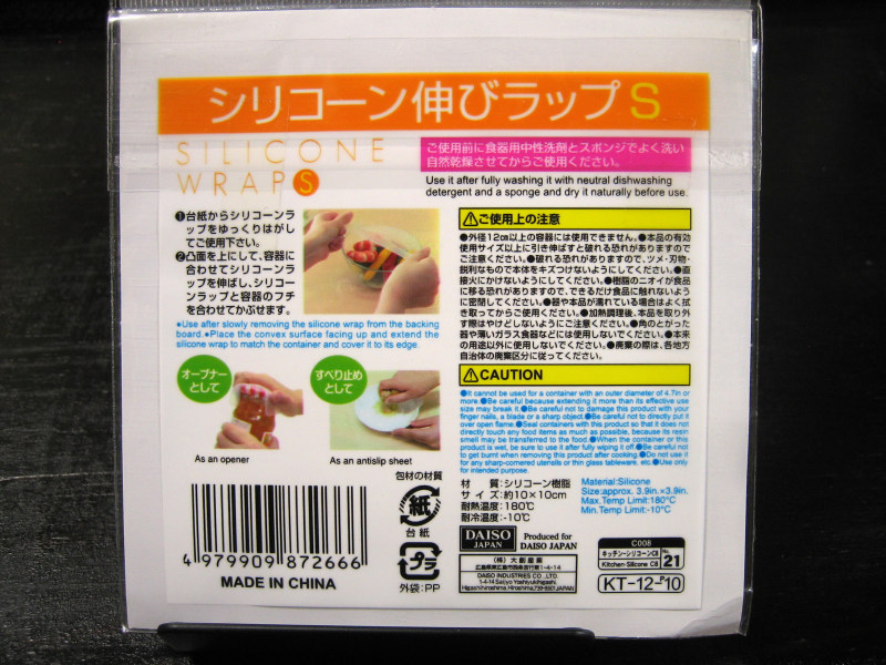 100円ショップ(ダイソー)にて、シリコン蓋と一緒に、シリコンのラップも購入しました。