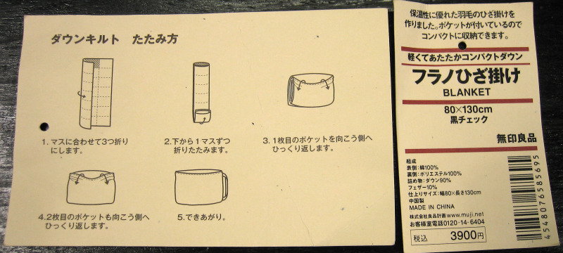 購入したのは、無印良品の『コンパクトダウンフラノひざ掛け (黒チェック)』、定価3,900円(税込)です。