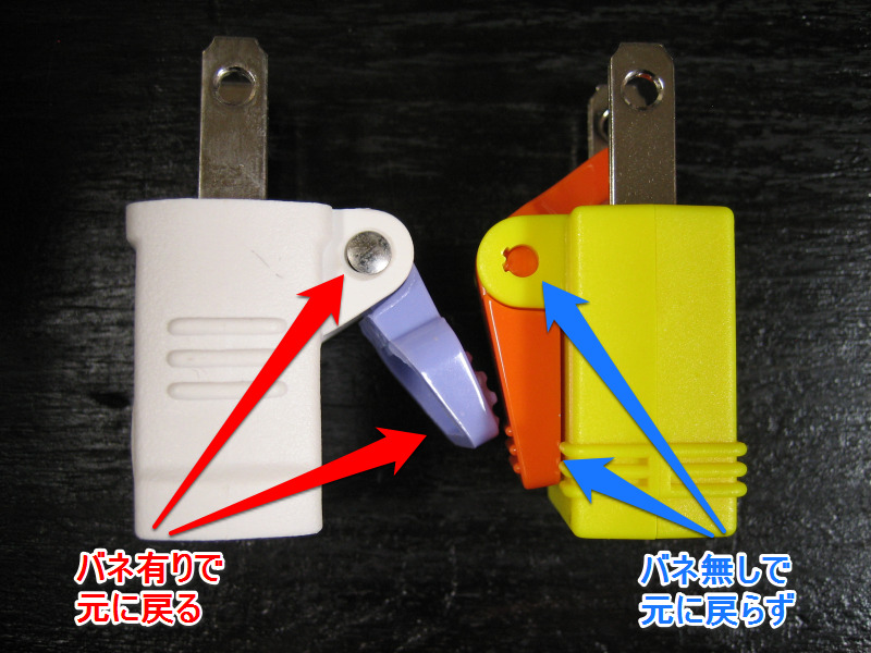 ELPA『楽に抜けるアダプター』の方にはバネが入っていて、レバーを押しても元に戻るギミックがあるのですが、ダイソー『らくらく抜ける電源プラグアダプター』にはバネが入っていません。