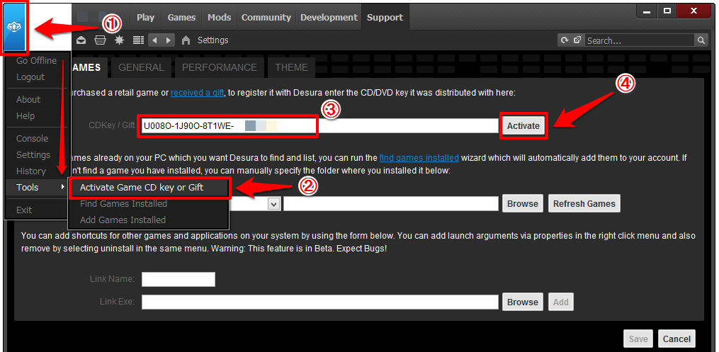 ②、メニューが下にドロップダウン表示されるので、【Tools】から【Activate Game CD key or Gift】を選択します。