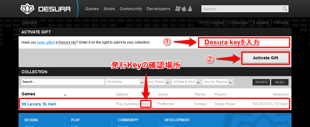 ①、入力フォームにDesuraキーを入力します。