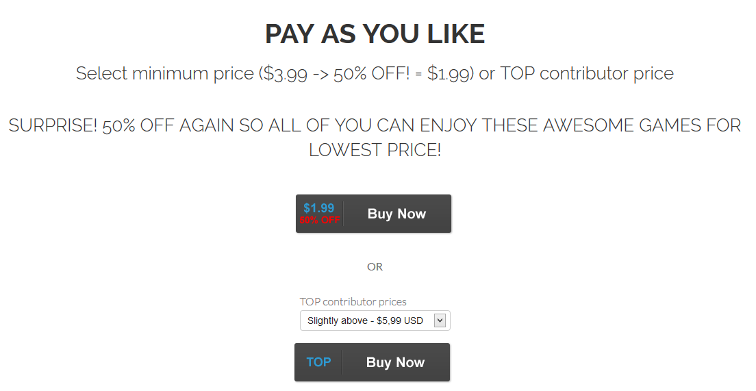 販売価格は選択制。最低$3.99(50%引き$1.99)で全てのゲームが貰えます。購入したゲームはSteamか、DesuraにKeyを登録してからDLするシステムです。