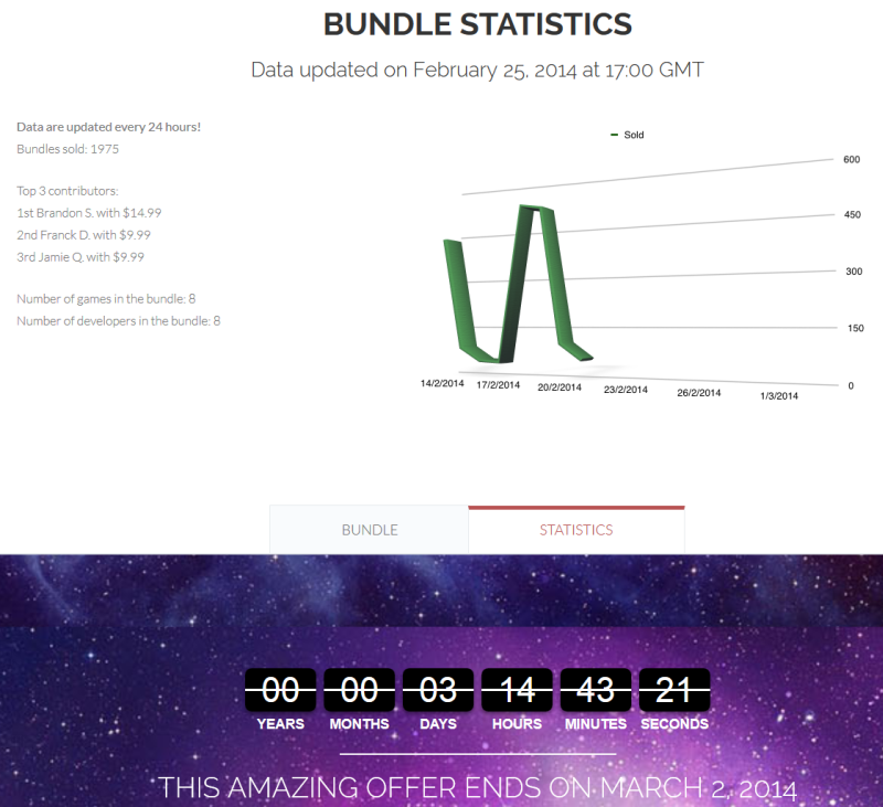 まだ知名度が低い為か、25日までのデータで約2000バンドルしか売れていません。Humbleだと例えゲームラインナップの評判が悪くても数日で数万バンドルは売れるので、比べてしまうと、ちょっと購入するのが不安になります。
