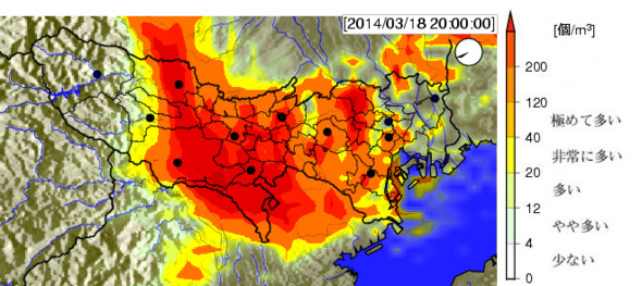 東京周辺限定で詳細な花粉飛散状況が見れる東京都健康安全研究センターの『とうきょう花粉ネット』だと、上の様な表示になります。