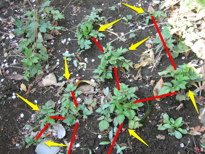 この矢印の先の芽が赤い線の様な形で地下茎で繋がっています。