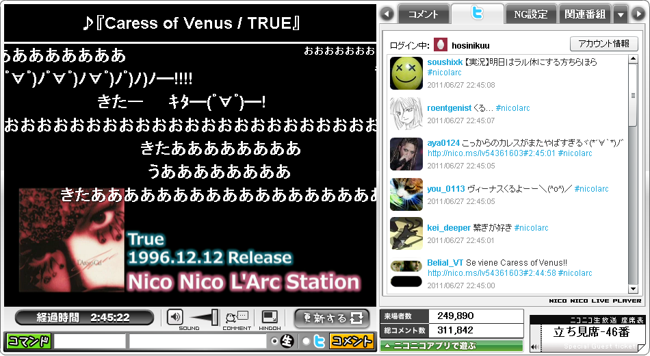人気の曲はコメントも厚く、特徴的なフレーズがある時には弾幕が起きていました。放送状態はPVが有名だった曲はPV付きで放送、それ以外はジャケ写真と曲だけの黒画面といった感じでした。(上の写真参照)