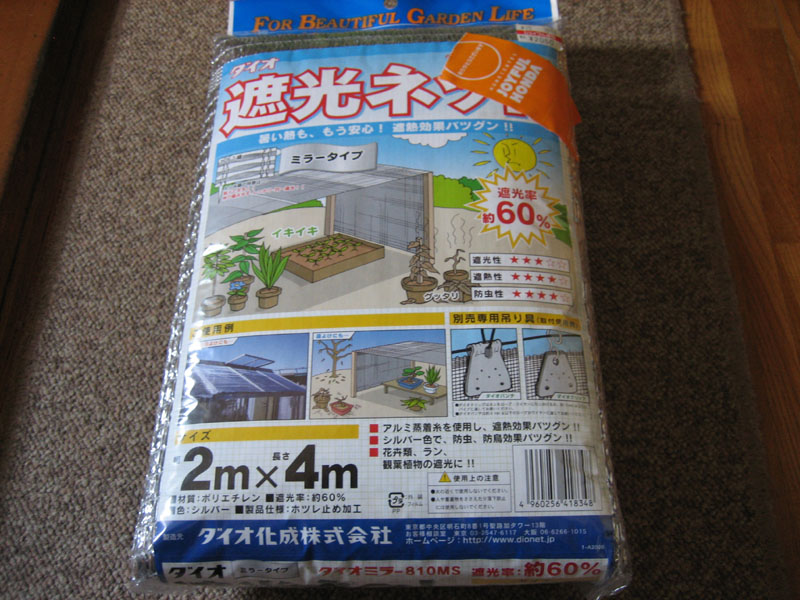 アルミ蒸着のポリエチレン繊維で、遮光率は60%ながら遮熱性はピカ一です。光を反射するので効果は納得ですね。また、防虫効果と防鳥も期待できるそうです(おそらく反射光効果で)。