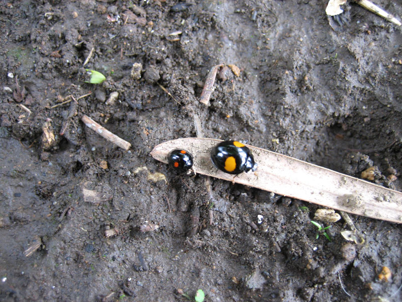 右は通常サイズのテントウムシ、具体的な種類はナミテントウです。左が小さいテントウムシ、右のナミテントウの3分の1、いや、4分の1程度のサイズしか ありません。初めて見たので、最初ナミテントウの小型体だと思ったのですが、調べたところ小さい種類のテントウムシだということが判りました。その名もヒメアカホシテントウです。