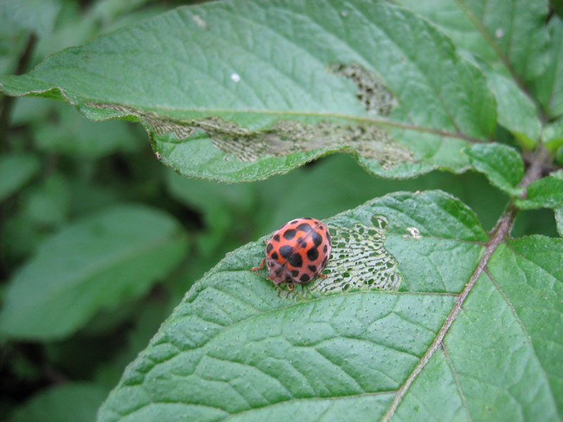アブラムシを食べるナナホシテントウや、ナミテントウとは違い、名前の通りアザミや、ジャガイモの葉っぱを食べる草食性の害虫で、大量発生すると葉っぱを食い荒らされる厄介な虫です。