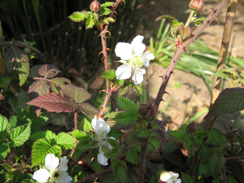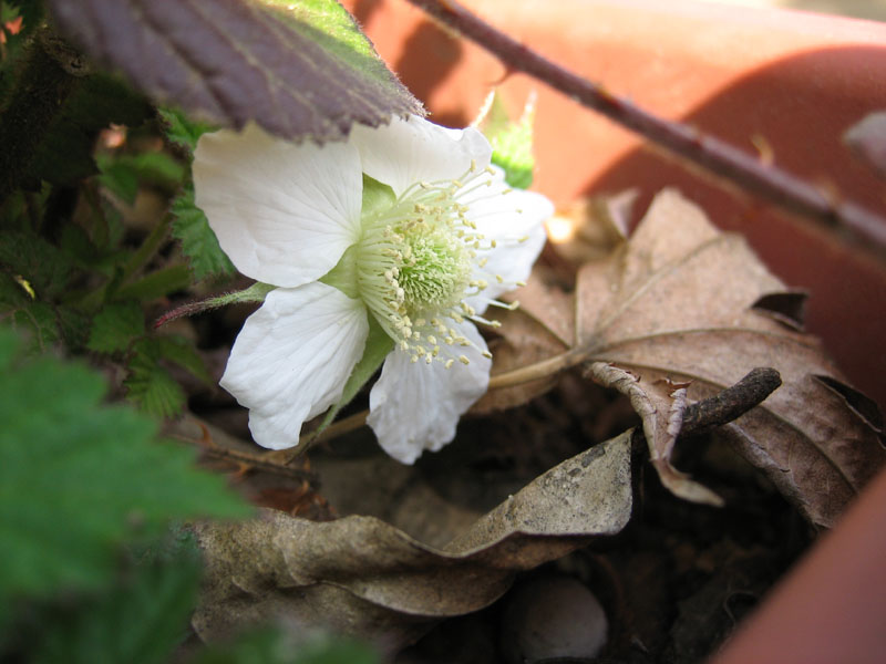 矮性品種だけあって、普通のラズベリーのように大きな面積をとられることはありません。また、花はベリー系の花を付けて綺麗です。ただ、カギ爪状になっているトゲが凶悪で、扱いには困ります。