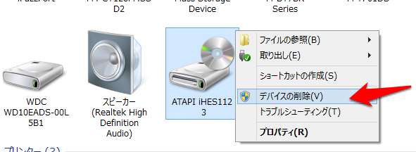 デバイス一覧からBD/DVDドライブを選択して右クリック。